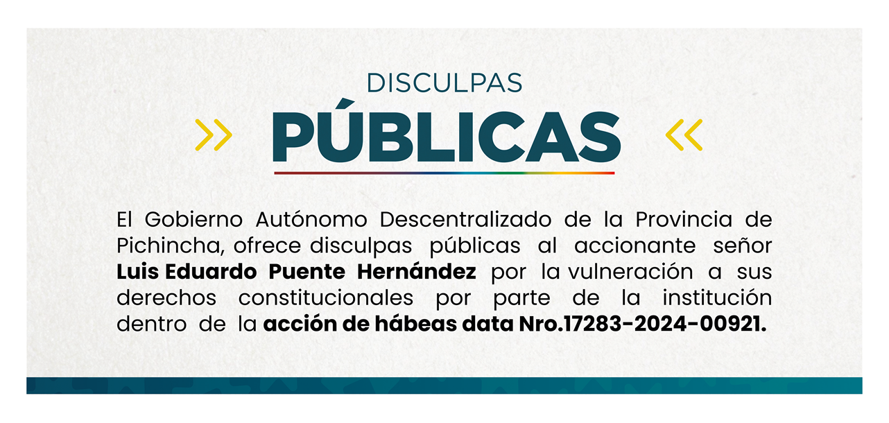 El Gobierno Autónomo Descentralizado de la Provincia de Pichincha, ofrece disculpas públicas al accionante señor Luis Eduardo Puente Hernández por la vulneración a sus derechos constitucionales por parte de la institución dentro de la acción de hábeas data Nro.17283-2024-00921.